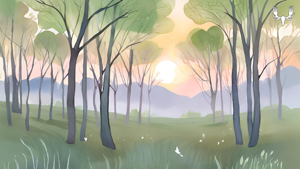 Sunlit meadow clearing framed by trees and pink wildflowers, MeatEater logo top-right