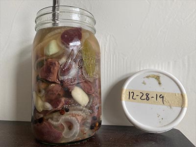 Alternate your brine ingredients like this: onion, bay leaf, garlic, red pepper, and tongue until the jar is nearly full. Next, fill the jar with the liquid brine solution. I like to use a canning jar and lid, but I have used quick seal lids with an extra layer of saran wrap. Label your jar with the date and pop it in the fridge.